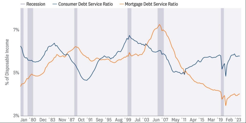 As millions of Americans took advantage of low rates, homeowners have historically low debt service payments as a percentage of their disposable income, as highlighted in the chart below. Refinancing, mostly with fixed-rate mortgages added to the spending splurge, delayed the inevitable landing, and created a headache for policy makers dealing with an economy less sensitive to interest rate policy.