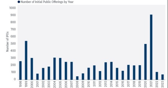 During the period of extraordinarily low interest rates, private equity/venture capital firms across the globe supported smaller privately-held businesses, especially start-up “unicorns” valued at $1 billion or more. At the end of 2023, there were approximately 554 unicorns globally. This is in addition to broad support for a wide range of companies within many sectors. The goal for financial backers is to unwind the enterprise and apply for the IPO process in order to return a profit for shareholders.