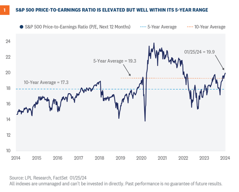 While we acknowledge this P/E is on the high side, if there was a time to pay up for earnings it should be when growth is reaccelerating after a downturn. Recall S&P 500 earnings were in recession last year, with year-over-year earnings growth resuming in the third quarter after three straight quarters of earnings declines. While LPL Research expects 7 – 8% growth in S&P 500 earnings per share this year, a soft-landing scenario could lift earnings beyond that forecast, making stocks look a bit cheaper.