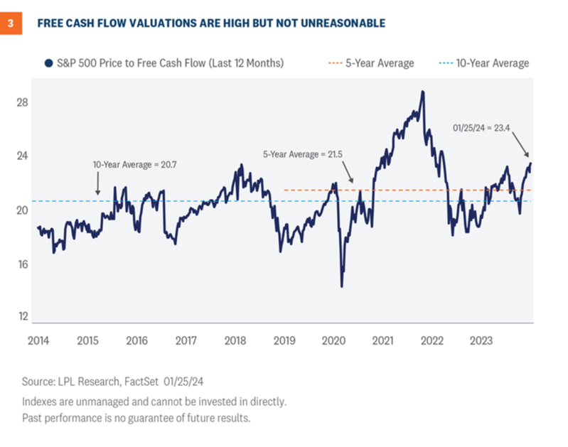 To value securities, or an index, on cash flow, we like to use free cash flow, or cash flow left after operating expenses and capital investments relative to price. By this measure, the S&P 500 is trading at a multiple of 23, about two points above the 5-year average and six points above the 10-year average(Figure 3). As a result, based on cash flows, we would suggest valuations are on the high side but not extreme.