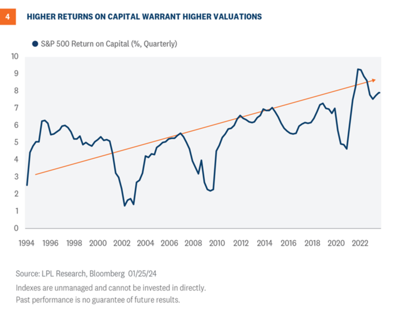 These are generally more “asset-lite” business models with higher returns on capital. In fact, returns on capital for the S&P 500 have moved significantly higher, even since the productivity boom and economic “digitization” in the late 1990s(Figure 4). This profit stream from a more profitable, less capital-intensive corporate America is worth more, which is likely a key reason why higher valuations have been sustained the past several years and may remain elevated.