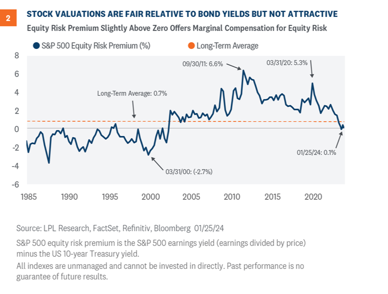 As of January 25, 2024, the ERP for the S&P 500 Index was 0.1%, which is below the long-term average of 0.7%(Figure 2). (Higher values mean stocks are less expensive relative to bonds, and vice versa.) Using the consensus earnings estimate for the next 12 months rather than the last 12 months pushes the ERP up to a more attractive level near 1%, but even at that number, the case for stocks over bonds on valuations is difficult to make. In other words, even factoring in relatively low interest rates by historical standards, with the 10-year yield near 4%, at best we can argue stock valuations are fair. Strong momentum and corporate fundamentals leave us comfortable with our neutral tactical stance on equities, but there is not much room for error. And we should watch the risks closely, particularly geopolitics.