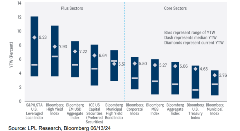 The Treasury Department is still expected to issue a lot of Treasury securities to fund budget deficits, and with the BOJ slowly ending its aggressively loose monetary policies in 2024, we could continue to observe upward pressure on yields. However, while supply/demand dynamics can influence prices in the near term, the long-term direction of yields is based on expected Fed policy. That doesn’t mean rates are going to fall dramatically from current levels though, and that is fine for the longer-term prospects for fixed income investors since coupon, and not price appreciation, has historically been the largest component of total returns, regardless of what happens to interest rates in the near term.