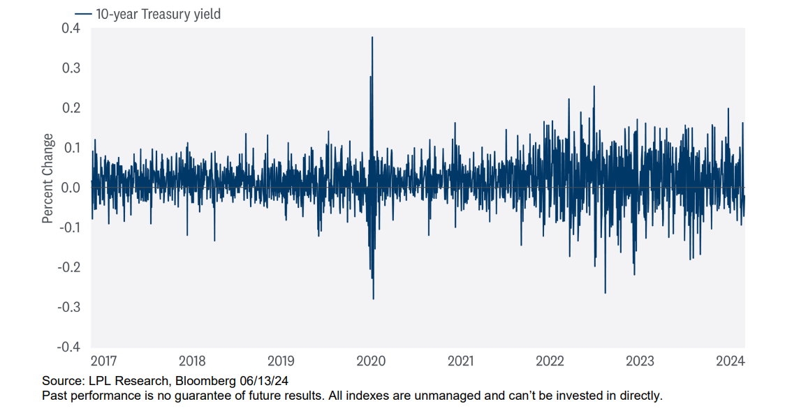 place after the June 7 jobs report that came in hotter than expected. Earlier that week, yields fell nearly 0.10% in a day after a different economic release (ISM Manufacturing) came in softer than expected. The chart below highlights the daily change in the 10-year Treasury yield, and recently, it isn’t uncommon to see large moves in yields — in either direction.