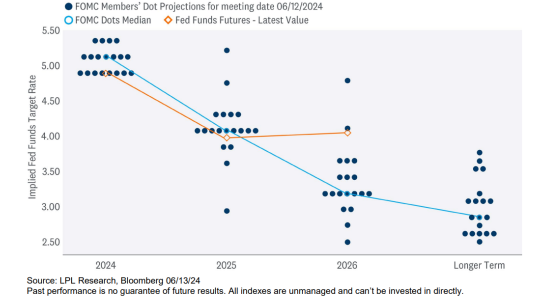 The expected highlight of last week’s Fed meeting was supposed to be the updated interest rate forecast, colloquially known as the dot plot, which is updated four times a year. As a reminder, 2 Member FINRA/SIPC the dot plot represents the expected path of short-term interest rates by Fed members. Each dot represents a member’s opinion on where the fed funds policy rate should be over the next few years. While not an official policy, it does provide additional transparency into Fed member thinking — albeit anonymously. Markets were expecting the Fed to pencil in two interest rate cuts this year (down from three last quarter), but the median dot actually reflected only one rate cut this year. However, it was a close call between one or two cuts this year. Eight participants anticipated two cuts, while seven saw only one — and four saw no cuts this year at all.