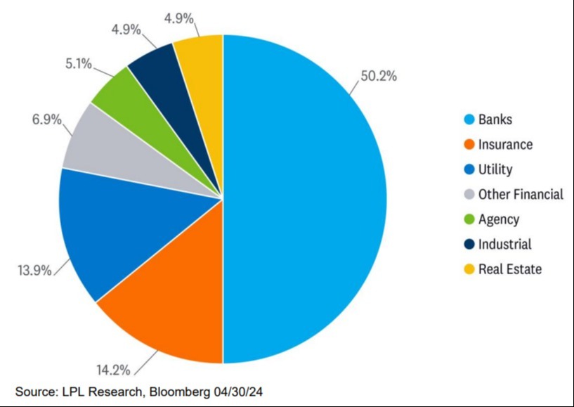 That said, and as mentioned above, it’s important not to paint a broad distressed-brush across all CRE sectors. The office sector only represents roughly 19% of total CRE loans and other sectors, such as malls and hotels, are performing fine. It’s the office sector that is the primary challenge for financial institutions, and even there, the financial institutions at elevated risk are the smaller and more regional banks that make up over 60% of lending to the office sector. As such, less than 40% of lending comes from national banks, which tend to make up the majority of preferred security issuance. Depending on the index, regional banks only make up a high single/low double-digit percentage of preferred security issuance.
