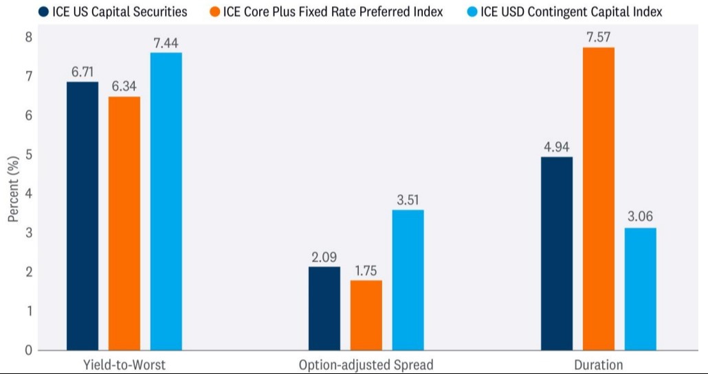There are three primary segments of the preferred market — 1) retail (known as $25 par), 2) institutional (known as $1,000 par), and 3) Contingent Convertible (known as CoCo). In total, the preferred market is over $1 trillion, with the retail, institutional, and CoCo segments representing roughly 25%, 35%, and 40%, respectively, of the market. The retail market (ICE Core Plus Fixed Rate Index) is an exchange-traded market where the securities generally have longer durations and lower yields, whereas the institutional market (ICE US Capital Securities Index) is an over-the-counter-traded market where the securities pay dividends semi-annually. The CoCo market is primarily composed of European financial issuers (ICE USD Contingent Capital Index) with different characteristics and different risk premiums. CoCos came into existence following the Global Financial Crisis (GFC), with regulators creating CoCos as a means to provide an additional layer (known as Additional Tier 1 or AT1) of capital to absorb losses in the event of a bank default. It isn’t uncommon to have companies issue securities across the three markets.