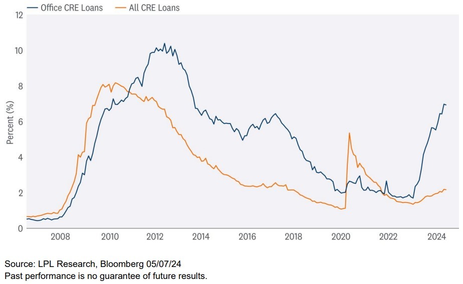 To fully understand the CRE challenges, LPL’s STAAC has regularly brought in outside experts to present to the Committee with the key takeaway that this is a problem that may take several years to play out. Moreover, in our view, the CRE challenges are largely idiosyncratic. And while delinquency rates in CRE loan books remain elevated, we do not think they pose a systemic risk to the banking system.