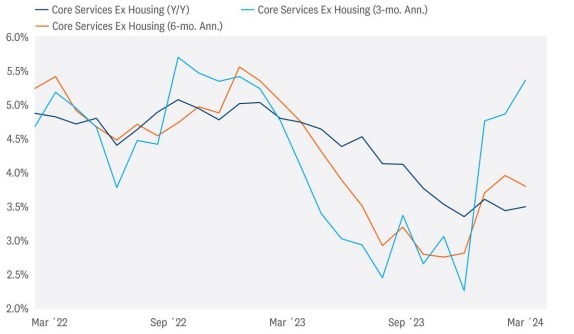 - Inflation for services and goods are on two very different glide paths. Annual services inflation was 4% in March, but goods inflation was roughly flat. We will continue to watch services inflation closely.