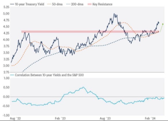 Treasury yields are inversely related to rate cut expectations. As the market repriced the probability of the Fed keeping things on hold for longer than originally anticipated, yields jumped higher across the curve. The closely watched 10-year Treasury yield surged over 40 basis points this month to around 4.60%, a far cry from the 3.88% starting point of the year. Technically, yields have also broken out above key resistance near 4.35%, a level tracing back to the October 2022 highs and a tipping point for risk appetite last summer. And while today’s price action shares some parallels to then — surging Treasury yields contributed to selling pressure in an overbought equity market — stocks have thus far absorbed the recent jump in rates much better. This is demonstrated by a less negative correlation between the S&P 500 and 10-year Treasury yields between now and then, suggesting markets may be a little more comfortable in the economy handling higher rates this time around.