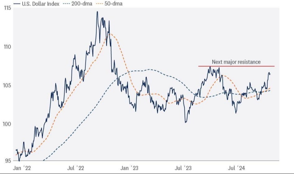 The U.S. dollar has rerated higher amid the shift toward higher-for-longer monetary policy. Momentum in the greenback suggests a retest of the 2023 highs could be underway. And while a stronger dollar creates headwinds for U.S. multinational companies generating revenues abroad, it can also create headaches for other central banks.