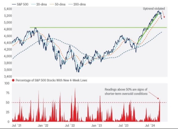 Overbought conditions often leave investors searching for reasons why the market needs to sell-off. The shift to higher-for-longer monetary policy serves as a compelling excuse for reduced risk appetite, especially when paired with hot inflation data, hawkish Fedspeak, surging yields, and headlines of a war escalating further in the Middle East. Technically, the S&P 500 has pulled back through a shorter-term uptrend and violated its 20- and 50-day moving averages (dma).