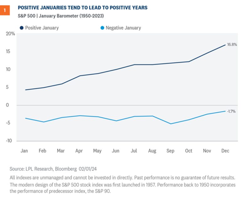 A positive January has historically been a bullish sign for stocks. Yale Hirsch, creator of the “Stock Trader’s Almanac”, first discovered this seasonal pattern back in 1972, which he called the January Barometer and coined its popular tagline of ‘As goes January, so goes this year.’ Here, we assess the likelihood that this popular stock market adage delivers more gains for investors this year. The weight of the evidence leans toward yes, as we explain.